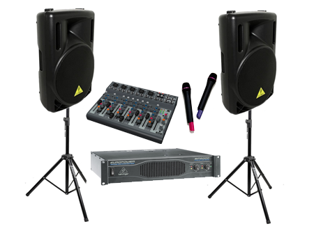 • Behringer Eurolive B212XL + Europower EP2000: 2 satellite speakers. Passive speakers. 400 W continuous / 1.6kW peak system. With 2kW amplifier.